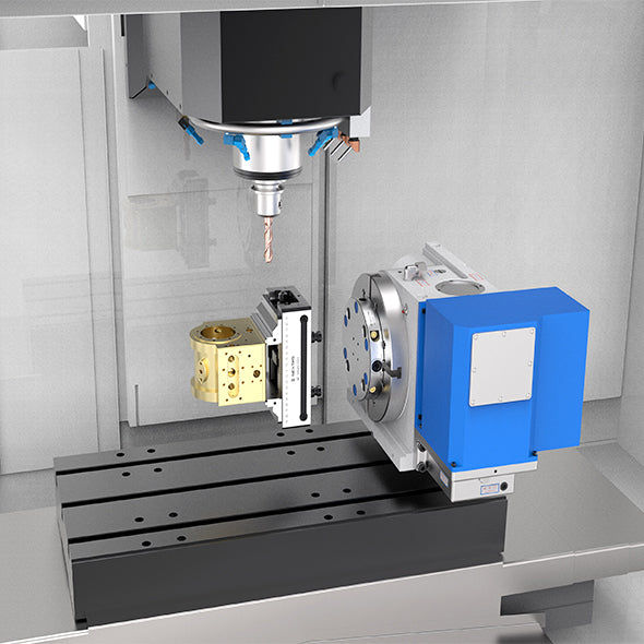 Nextas Zero Point Plates easily mount to 4th axis rotary tables where vices and custom tombstone fixtures can be quickly hot swapped without manual realignment.